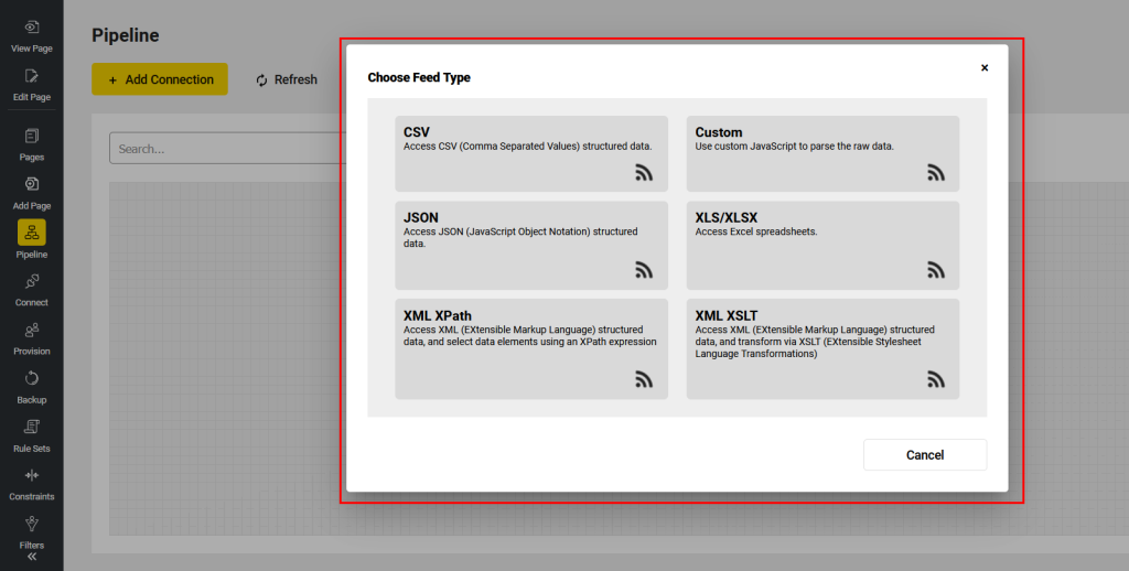 A feed brings data or web content in from a defined connection. Data Parsers are used within Feeds to parse document data such as CSV, JSON, XML, etc. These data parsers transform document data into a tabular data set which can then be used in visualizations.