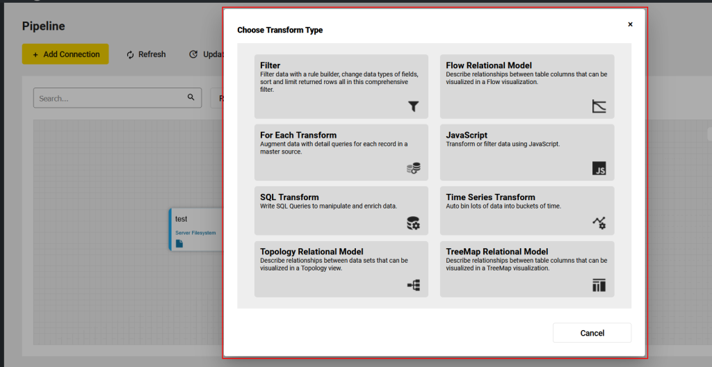 JavaScript Enables users to manipulate data programmatically using JavaScript; The JavaScript Transform can return a new, possibly restructured, dataset.